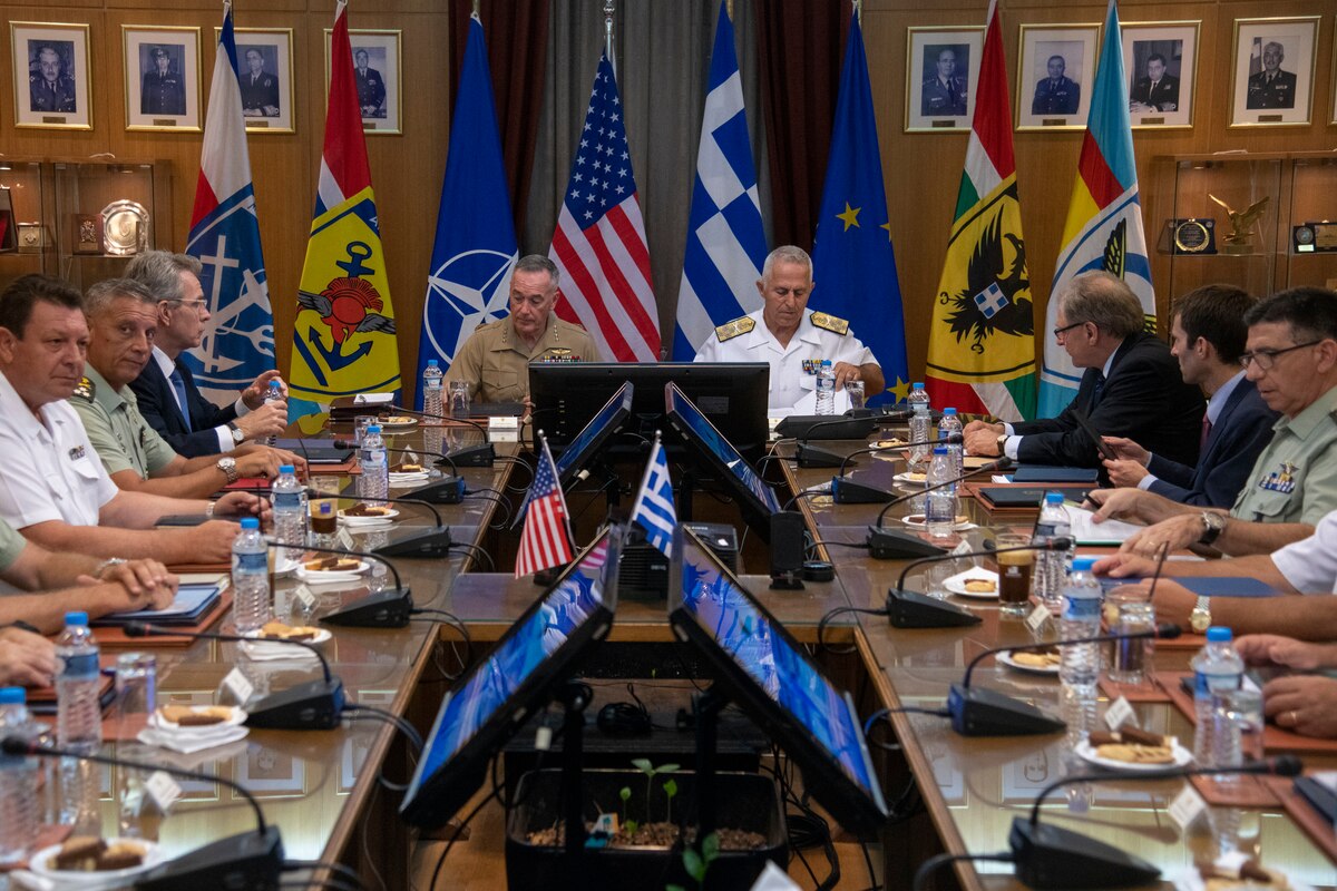 Marine Corps Gen. Joe Dunford, chairman of the Joint Chiefs of Staff, meets with Greek navy Adm. Evangelos Apostolakis, chief of the Hellenic National Defense General Staff, at the Ministry of Defense in Athens, Greece, Sept. 4, 2018. DoD photo by Navy Petty Officer 1st Class Dominique A. Pineiro